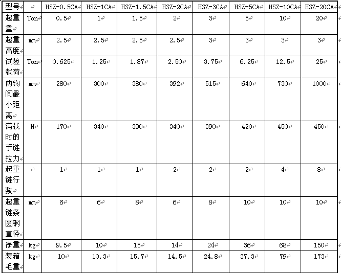 重慶凱榮20噸HSZ-CA型系列手拉葫蘆技術參數(shù):